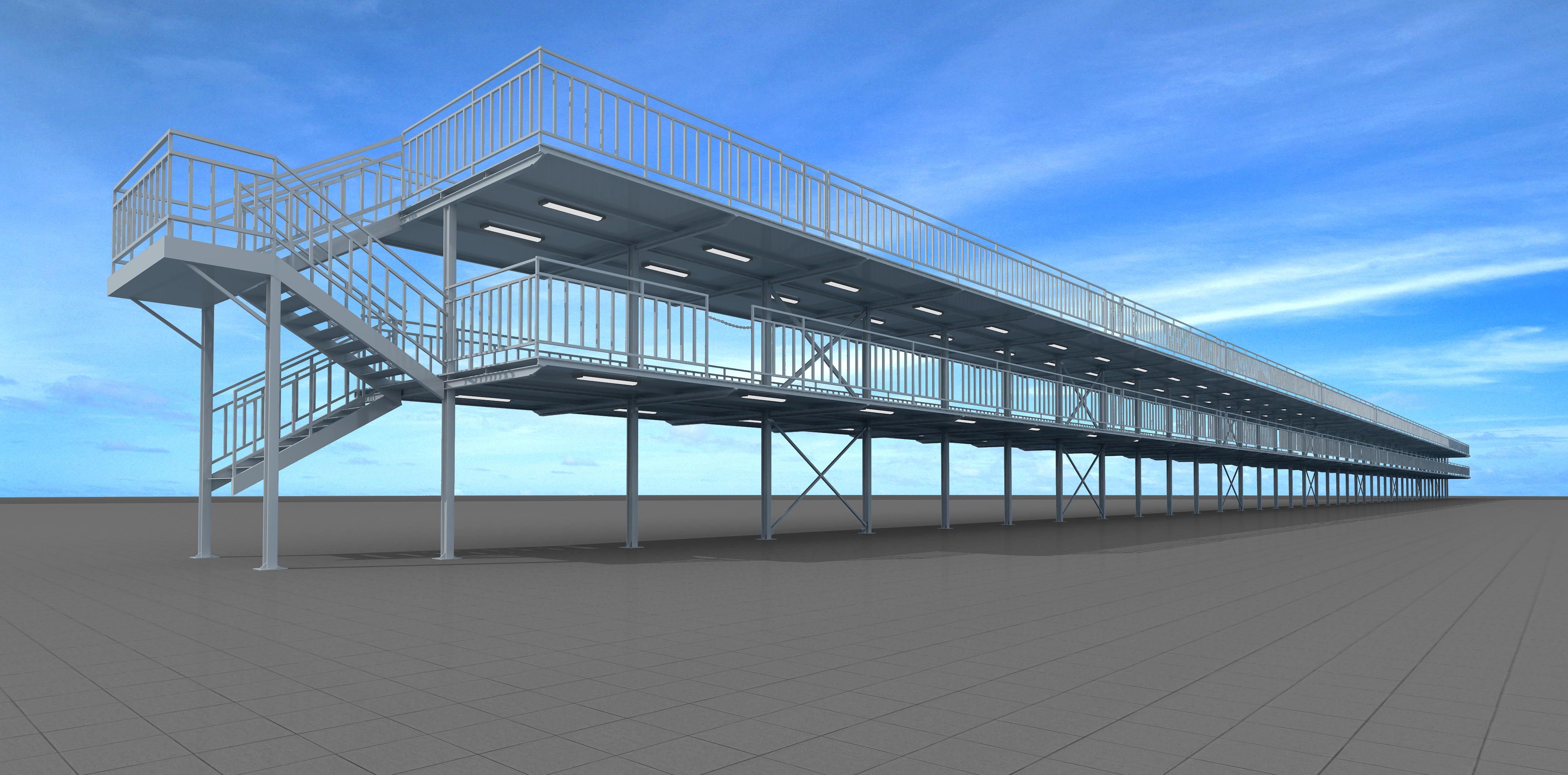 上圖為地鐵車輛段三層檢修作業(yè)平臺。采用全鋼結(jié)構(gòu),為地鐵車輛檢修、維護(hù)提供操作平臺。